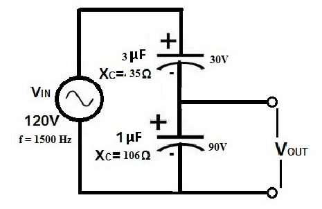 示例電容式交流分壓器電路圖如下所示,電壓源為120V;頻率為1500赫茲。電路中的兩個(gè)電容簡(jiǎn)單串聯(lián),其中第一個(gè)電容值VC1 3uF與電容Xc為30ohms。第二個(gè)電容值VC2為1uF,電容Xc為60ohms。