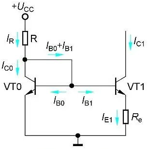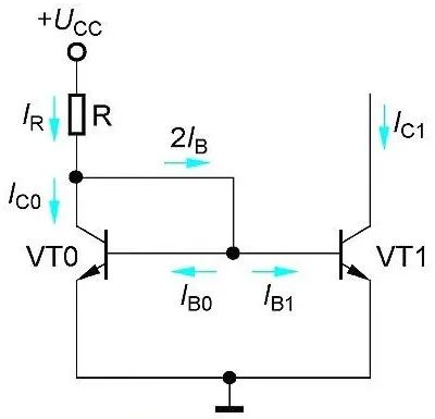 如下圖所示為鏡像恒流源電路,它由兩只特性完全相同的管子VT0和VT1構(gòu)成,由于VT0管的c、b極連接,因此UCE0=UBE0,即VT0處于放大狀態(tài),集電極電流IC0=β0*IB0。另外,管子VT0和VT1的b-e分別連接,所以它們的基極電流IB0=IB1=IB。設(shè)電流放大系數(shù)β0=β1=β,則兩管集電極電流IC0=IC1=IC=β*IB?梢姡捎陔娐返倪@種特殊接法,使兩管集電極IC1和IC0呈鏡像關(guān)系,故稱此電路為鏡像恒流源(IR為基準(zhǔn)電流,IC1為輸出電流)。