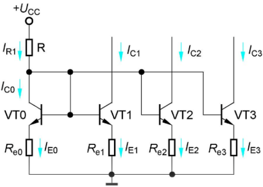 集成運(yùn)放是一個(gè)多級(jí)放大電路,因而需要多路恒流源電路分別給各級(jí)提供合適的靜態(tài)電流。可以利用一個(gè)基準(zhǔn)電流去獲得多個(gè)不同的輸出電流,以適應(yīng)各級(jí)的需要。下圖所示電路是在比例恒流源基礎(chǔ)上得到的多路恒流源電路,IR為基準(zhǔn)電流,IC1、IC2和IC3為三路輸出電流。由于各管的b-e間電壓UBE數(shù)值大致相等,因此可得近似關(guān)系: